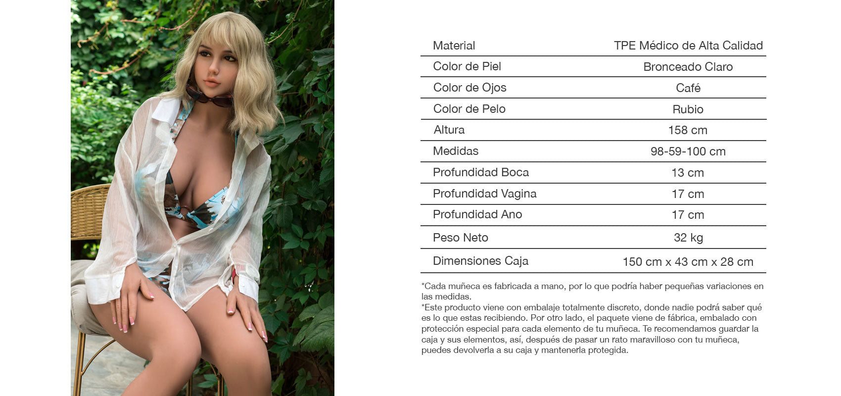 Alessia es una sex doll como ninguna otra. Su ondulado pelo rubio, sus jugosos labios y su piel suave y delicada son todo tuyas si lo deseas. Con 158 cm de estatura y senos exquisitamente blandos, puede volver loco a cualquiera que cruce su mirada.