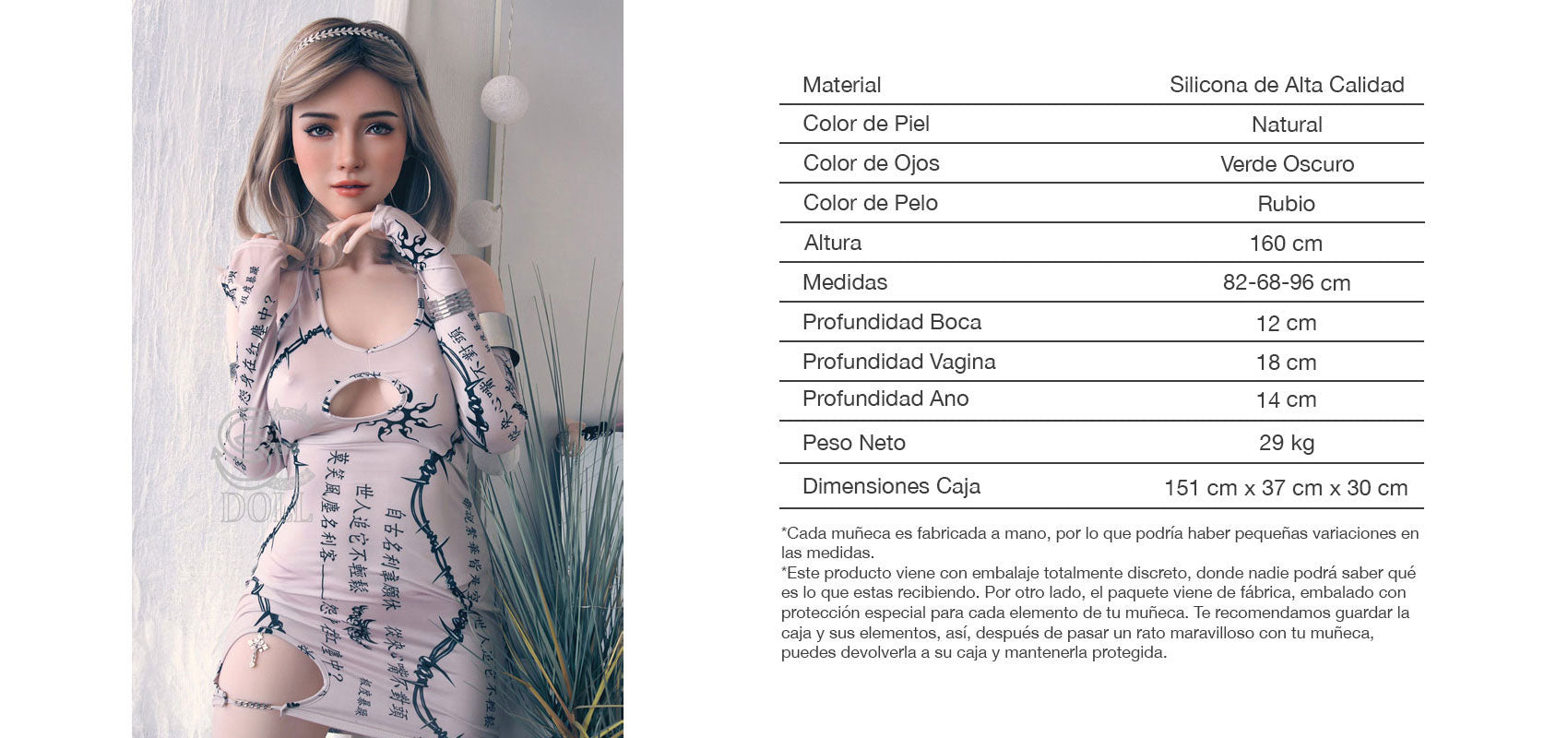 Annika es una de esas muñecas para adulto que irradia alegría con su pelo rubio y sus vibrantes ojos verdes llenos de vida. Divertida y juguetona, Annika está siempre lista para complacerte y llenarte de pasión.