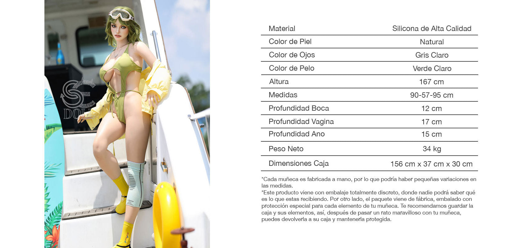 La caja vendrá sin ningún tipo de etiqueta o dibujo que haga referencia a una muñeca sexual, por lo que nadie más que tu sabrá lo que esta dentro. Las personas que vean tu caja pensaran que es un mueble, una lampara, o cualquier otro producto.