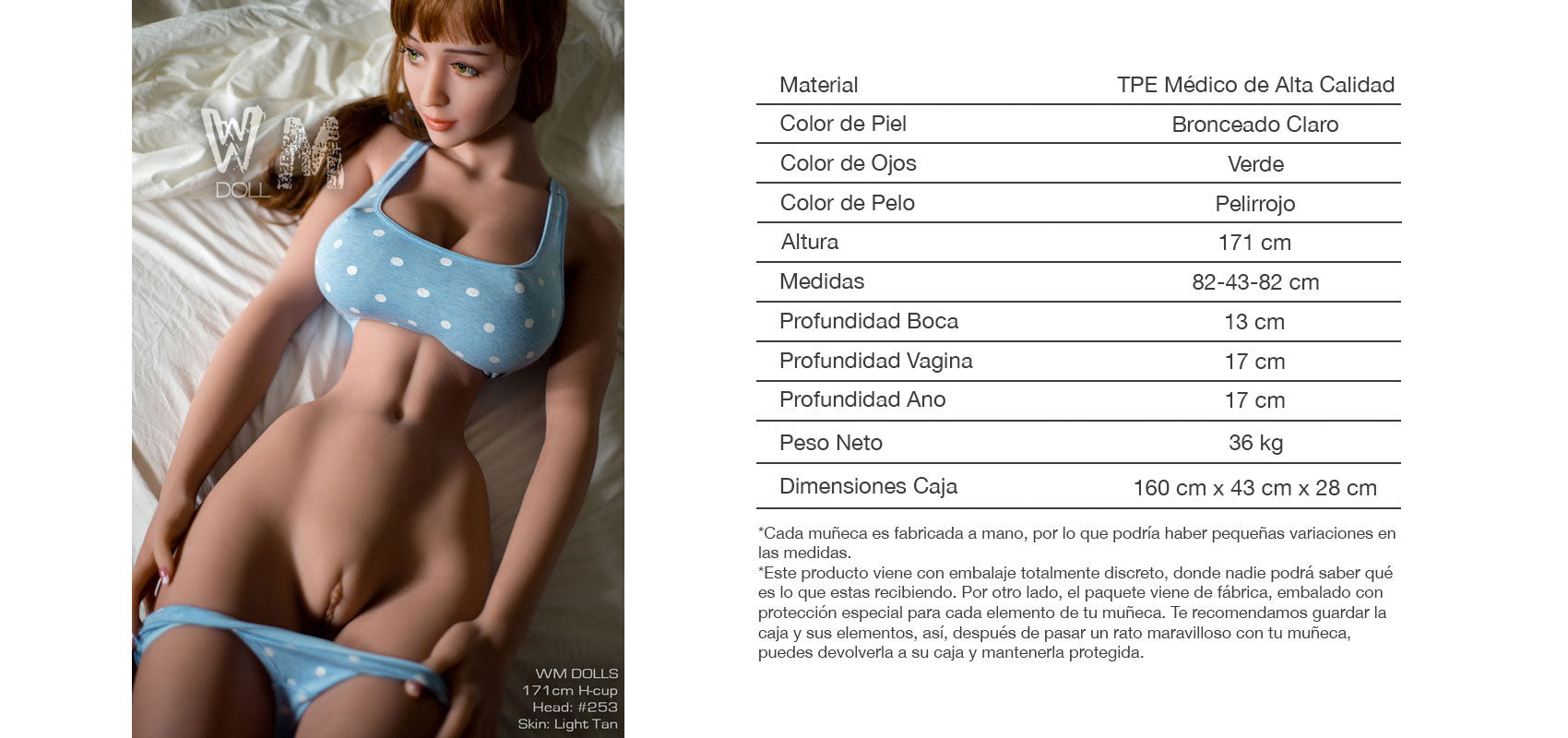 Reconocida por su calidad, WM Dolls produce una variedad de muñecas para sexo empleando una fórmula avanzada de TPE, que ofrece una textura suave al tacto y gran resistencia. Su diseño ergonómico y materiales premium garantizan una experiencia auténtica, cómoda y segura. Una alternativa de alto nivel para quienes desean una experiencia íntima sin comprometer el realismo.