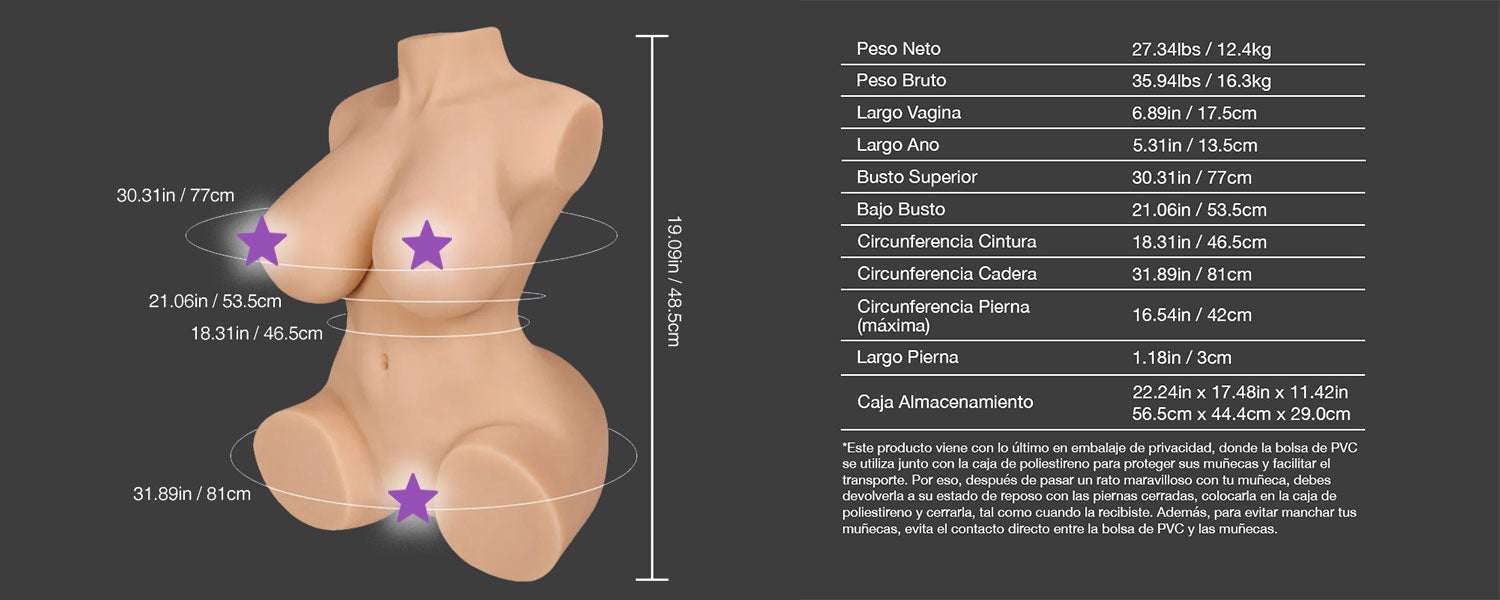 El torso sexual Britney 2.0 de Tantaly está diseñado para brindarte el máximo placer. Esta muñeca extremadamente versátil de 12,4 Kg está fabricada con TPE medico de última tecnología otorgándole una sensación de piel real al tacto. Viene con enormes senos decorados con pezones firmes y rosados, cintura delgada, trasero perfecto, muslos gruesos y detalles que replican perfectamente al cuerpo humano.