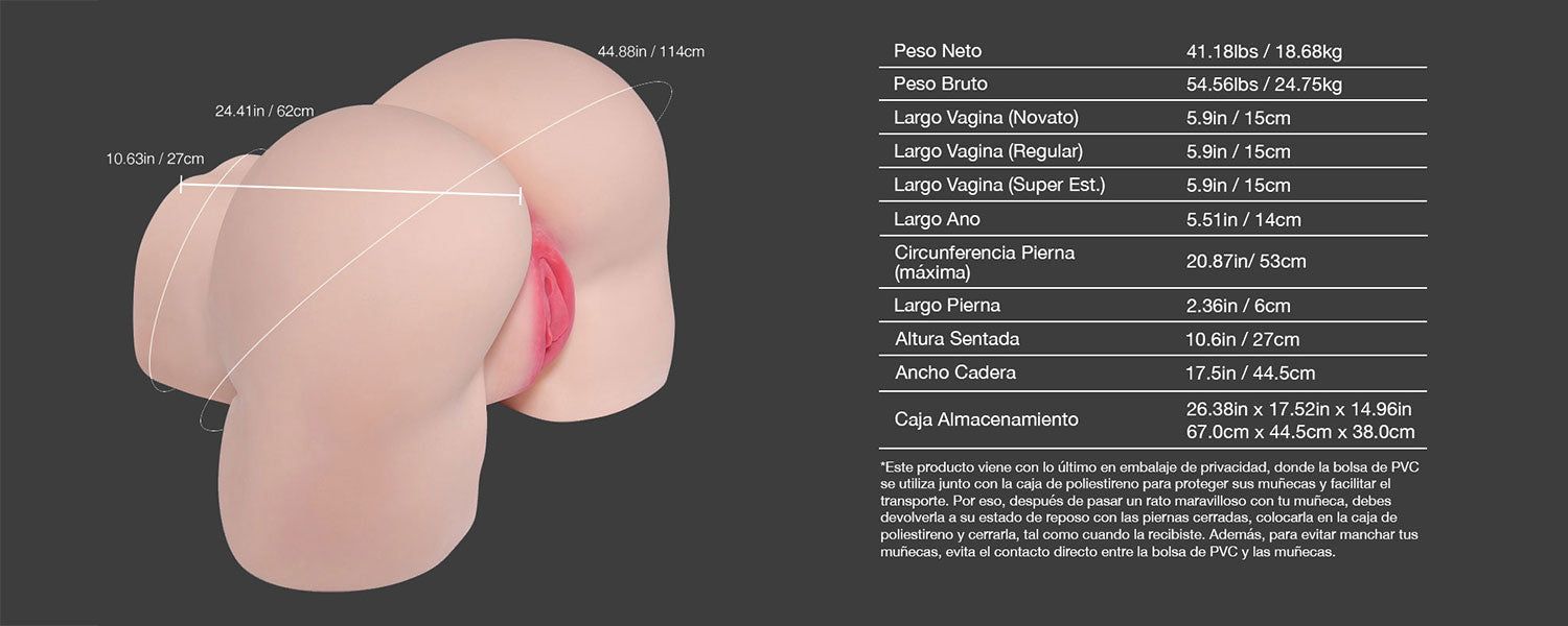 Disfruta del realismo en su máximo esplendor con la última tecnología Tantabutt, exclusiva de muñecas Tantaly, dándole a este trasero un aspecto y suavidad ultra realista. Viene con ano y vagina anatómicamente correctos, con textura y detalles en su interior para maximizar el placer.