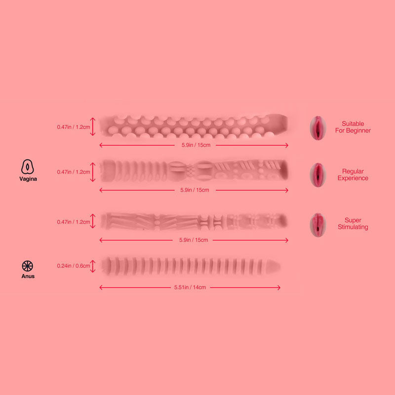 Daisy Pro ofrece tres niveles diferentes de estimulación con sus vaginas removibles. Desde principiante hasta súper intensa, dándote la libertad de elegir la sensación que desees. Tómalo con calma y, una vez que estés dentro, será un paraíso puro.