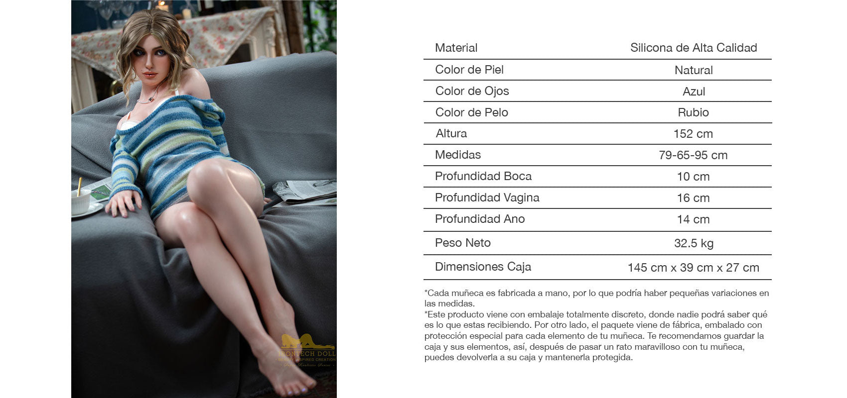 La caja vendrá sin ningún tipo de etiqueta o dibujo que haga referencia a una muñeca sexual, por lo que nadie más que tu sabrá lo que esta dentro. Las personas que vean tu caja pensaran que es un mueble, una lampara, o cualquier otro producto.
