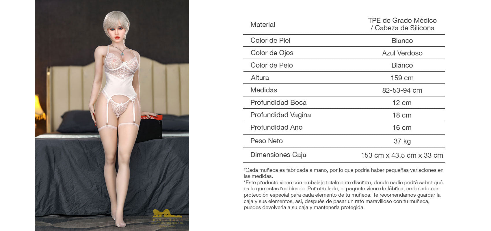 Las creaciones de muñecas Irontech Doll se caracterizan por ofrecer una sex doll con TPE que garantiza una experiencia realista y extiende la vida útil del producto. El esqueleto de metal interno ofrece fuerza, flexibilidad y libertad de movimiento. Diseñadas para durar, moverse con naturalidad y brindar una experiencia auténtica.