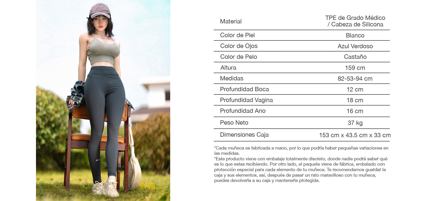Las creaciones de Irontech Doll se caracterizan por ofrecer una muñeca sexual realista hecha de TPE de alta gama, un material hipoalergénico, ecológico y muy suave al tacto. Gracias a su estructura interna de metal, pueden adoptar múltiples posiciones sin perder estabilidad. Estas muñecas para adulto Ideales para quienes buscan un producto duradero, realista y versátil.