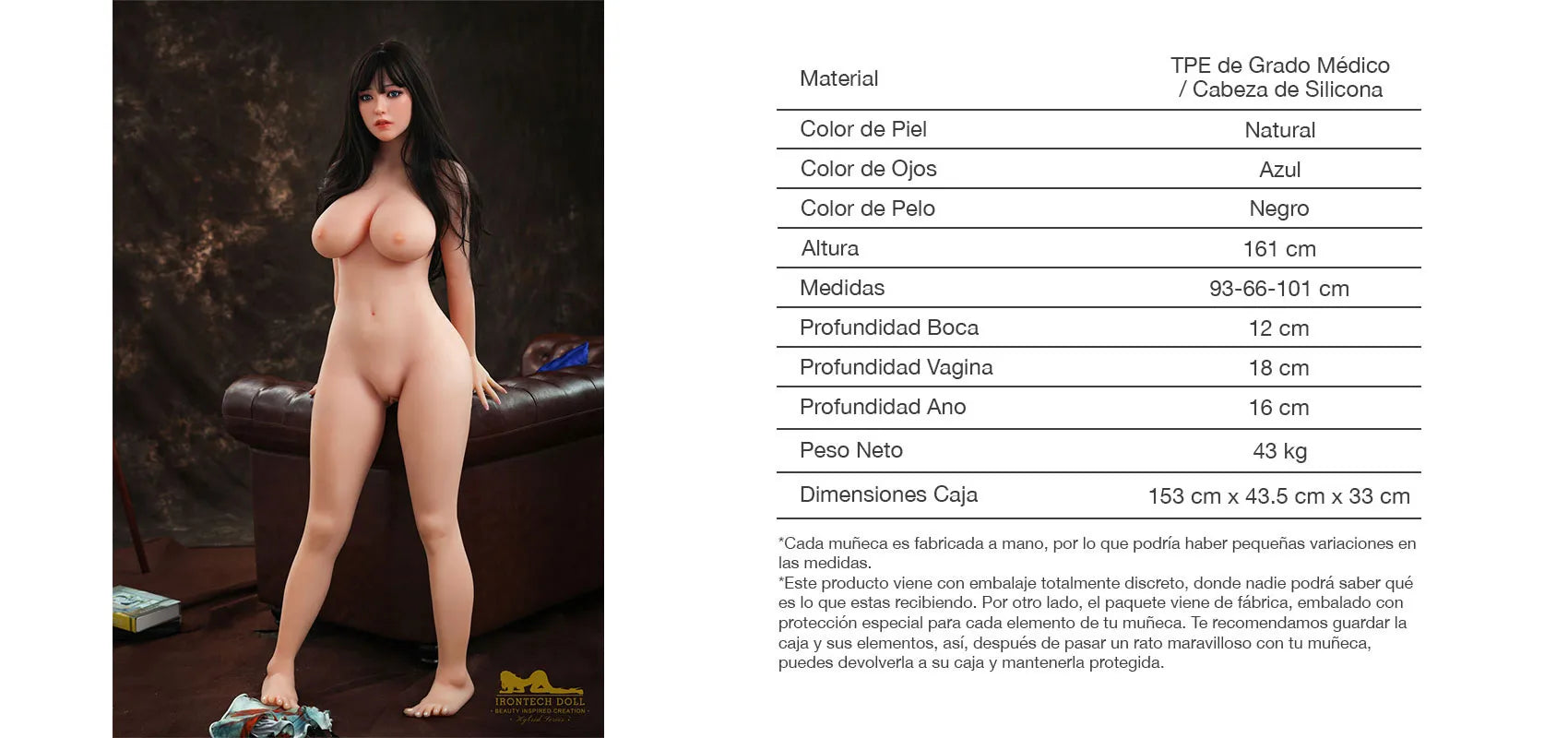 Con un enfoque en realismo y durabilidad, la marca Irontech Doll ofrece una sex doll fabricada en TPE ecológico, que brinda una sensación táctil auténtica y muy real. La articulación en muñecas, pies, rodillas y manos asegura una movilidad natural y fluida. Una alternativa premium para quienes valoran calidad y funcionalidad.