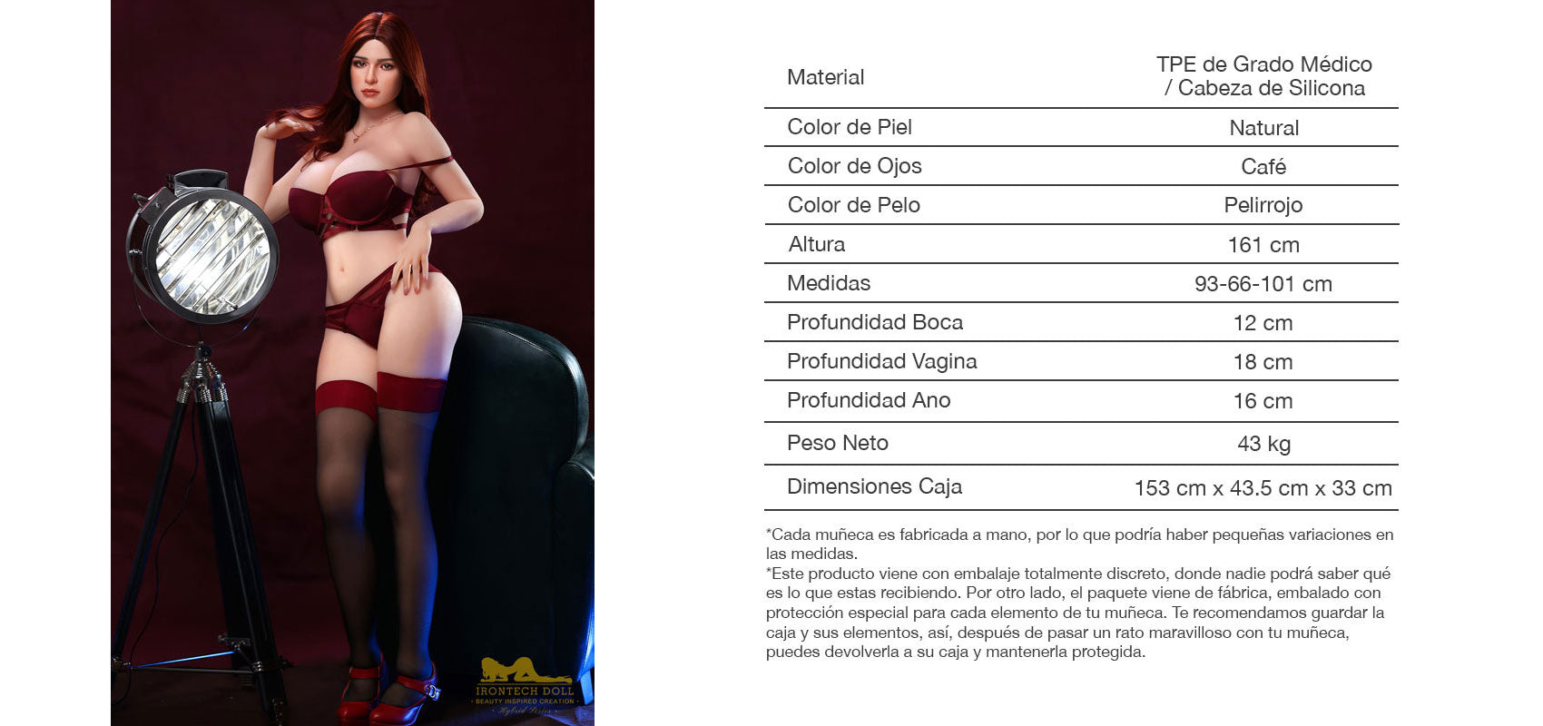Las creaciones de muñecas Irontech Doll se caracterizan por ofrecer muñecas para sexo hechas de TPE de alta gama, un material hipoalergénico, ecológico y muy suave al tacto. La articulación en muñecas, pies, rodillas y manos asegura una movilidad natural y fluida. Una alternativa premium para quienes valoran calidad y funcionalidad.