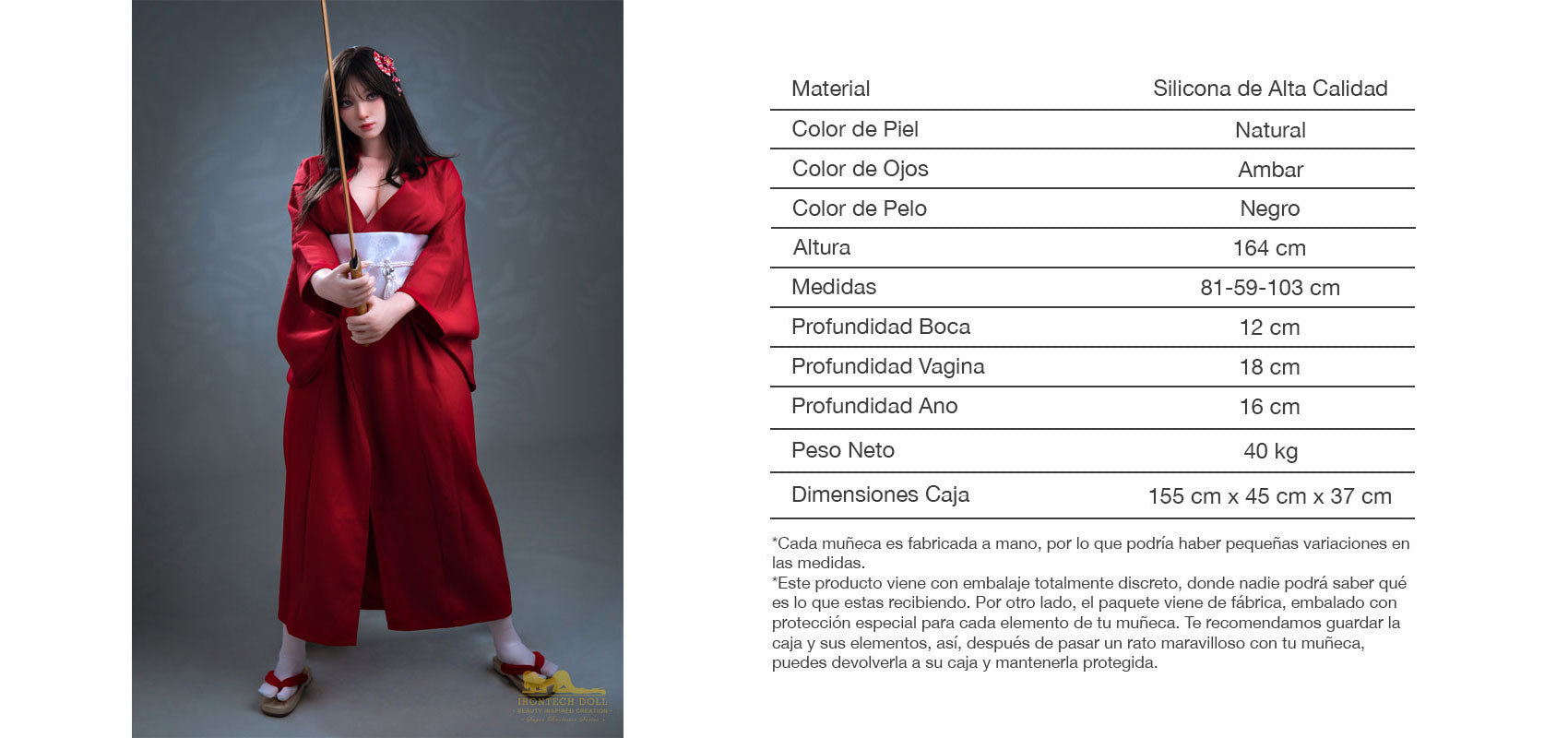 Descubre a Miyuki, la máxima expresión de la belleza y sensualidad asiática. Con esta maravillosa sex doll podrás sentir la verdadera experiencia de una Geisha. Ella esta lista para complacerte en cade detalle que imagines, y para entregarte su majestuoso cuerpo también.