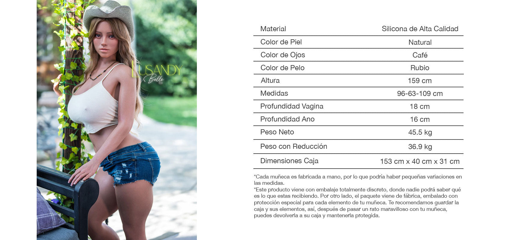 ¡Conoce a Belle, una encantadora sex doll vaquera que domina tanto las riendas como los corazones! Con su mirada dulce y su figura irresistible, convierte cualquier paseo al campo en pura fantasía. Ama el aire libre, los caballos... y es experta en montar bestias salvajes. ¿Te animas a cabalgar junto a ella?