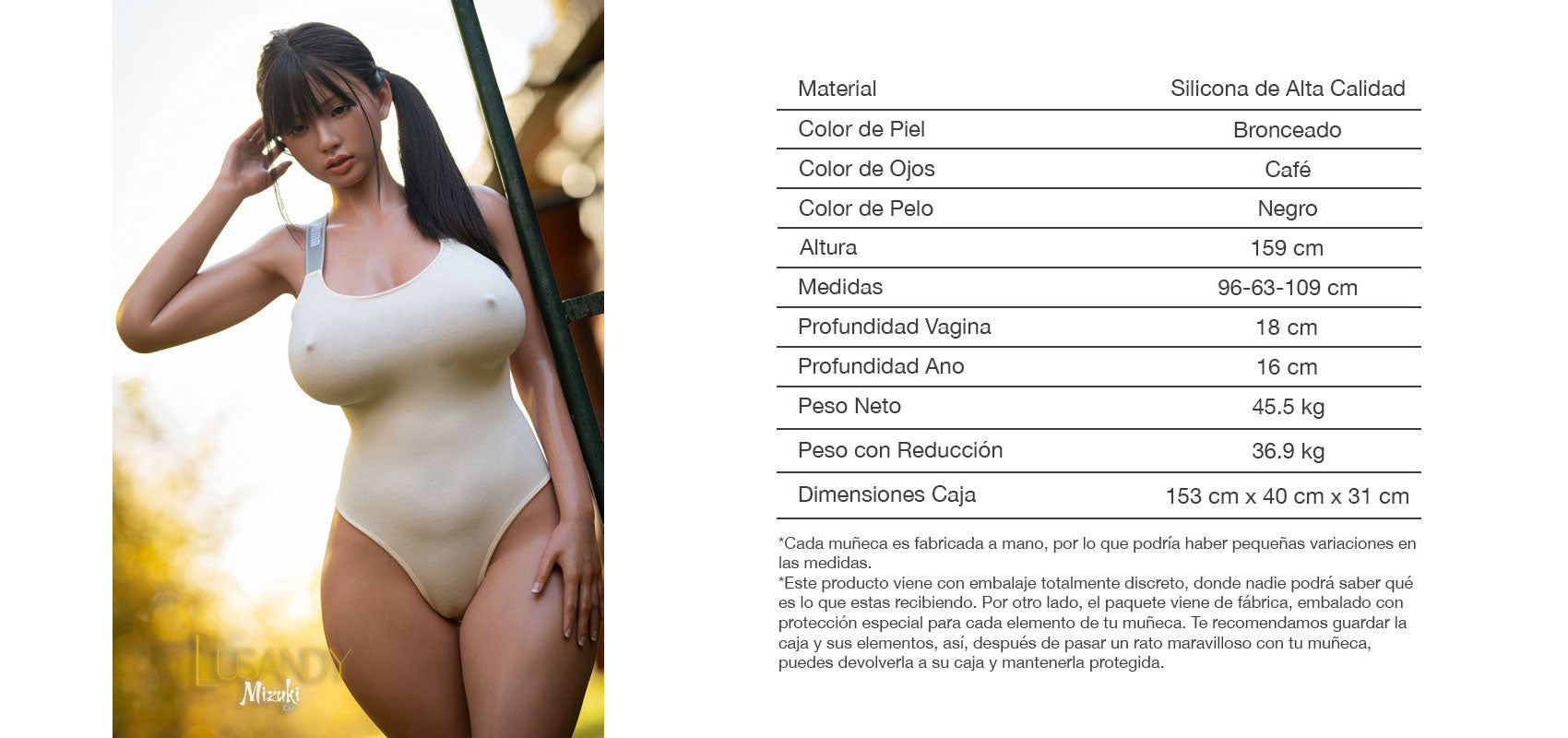 Mizuki es una adorable y sensual muñeca para sexo llena de energía. Su figura atlética y elegante calza perfecto con su cabello largo y su piel suave. ¡Ella estará siempre disponible para compartir contigo momentos de pasión y aventura!