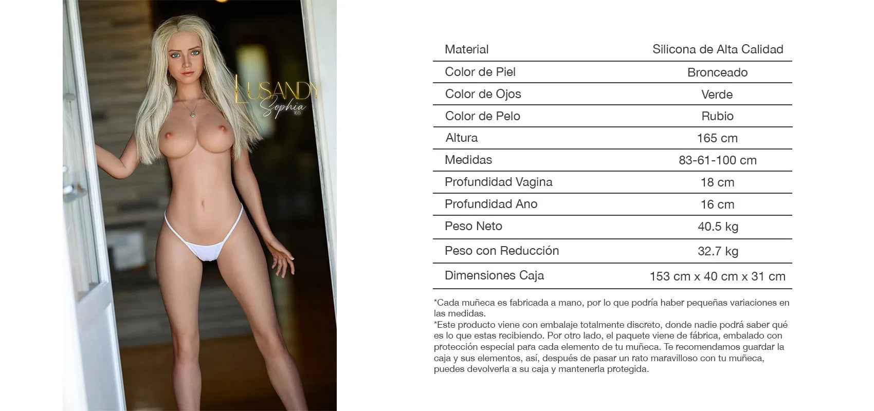 Sophia es una gema única y delicada. Esta hermosa muñeca sexual te cautivara con sus intensos y profundos ojos azules. Su firme cuerpo y su suave piel harán que se te ericen los pelos. ¡Atrévete a ser seducido por su encanto!