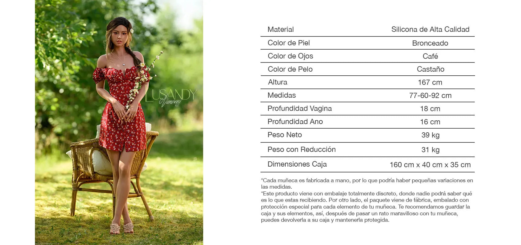La tecnología de reducción de peso de Lusandy Doll es excepcional, y hará de tu experiencia con estas muñecas sexuales realistas totalmente fascinante y cómoda. Te permitirá levantar a tu sex doll de 1.70 mts con facilidad y podrás ponerla en posiciones que anteriormente no eran posibles por el peso.