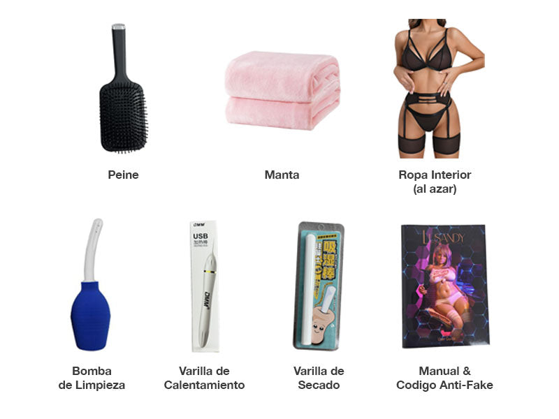 Cada una de las muñecas sexuales de Lusandy Doll viene con un set de accesorios incluidos para su cuidado. Dentro de la caja encontraras:
