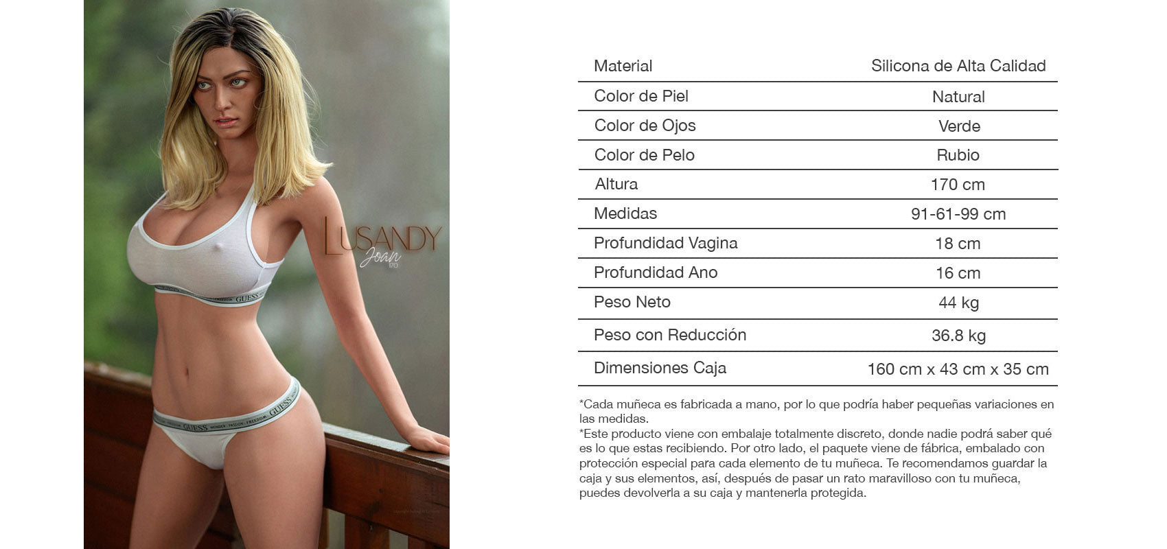 Joan es una muñeca para adultos con un cuerpo atlético, pero a la vez delicado y suave. Recorre cada centímetro de su cuerpo anatómicamente perfecto, y siente toda la pasión que esta obra de arte te puede entregar. ¡No esperes más y hazla tuya!