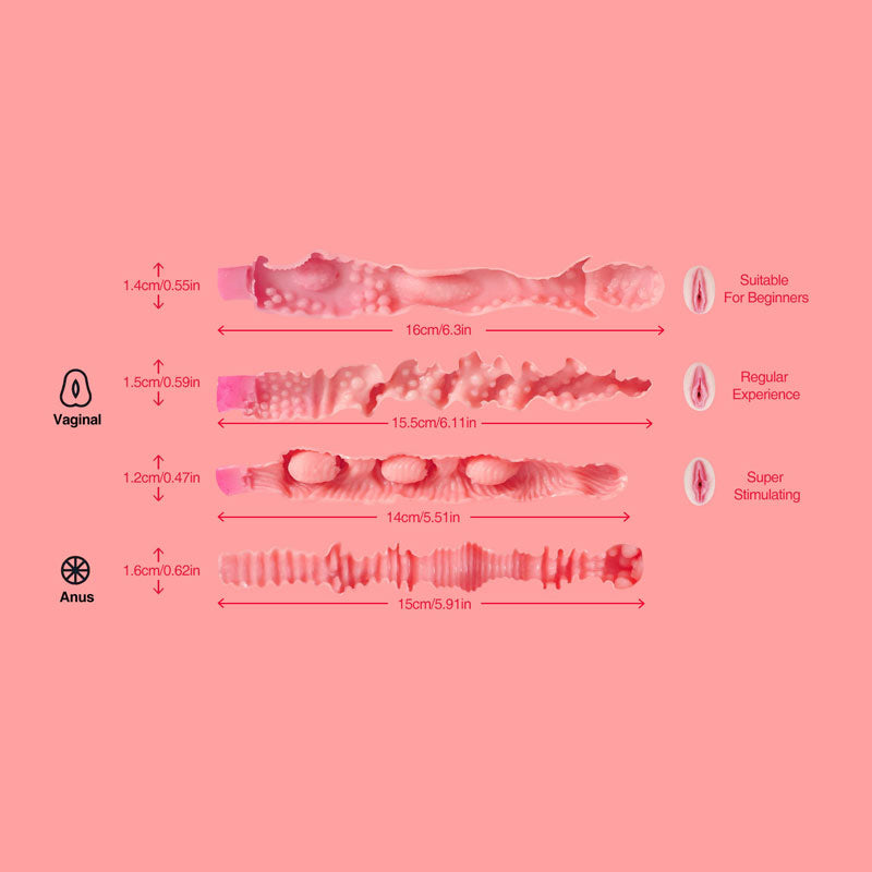 Mia tiene tres vaginas que aportan estimulación diferente. Deja que tu gran pene se deslice dentro de su vagina apretada y realista, pasarás a través de partículas y protuberancias de masaje grandes o pequeñas, sentirás la suave fusión del pene en el interior y obtendrás un placer de masturbación sin precedentes. Deja que la auténtica textura de Mia sorprenda todos tus sentidos. Ya sea entrenamiento para principiantes, estimulación regular o súper estimulación. Mia puede hacerse cargo perfectamente de tu erección.