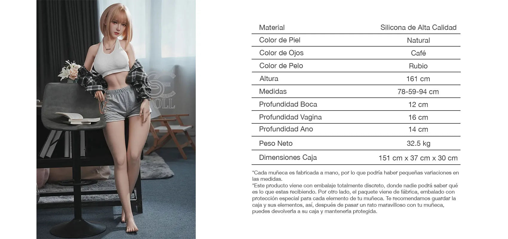 Hola, soy Bridget, una sex doll tierna pero muy apasionada. Atrévete a disfrutar de los momentos más románticos conmigo y te mostrare todo lo que una muñeca puede ofrecer. Podrás perderte por completo en mis suaves y perfectos senos, besar mi cuerpo por completo y colocarme en la posición que más te guste. ¡Te aseguro que no te arrepentirás!