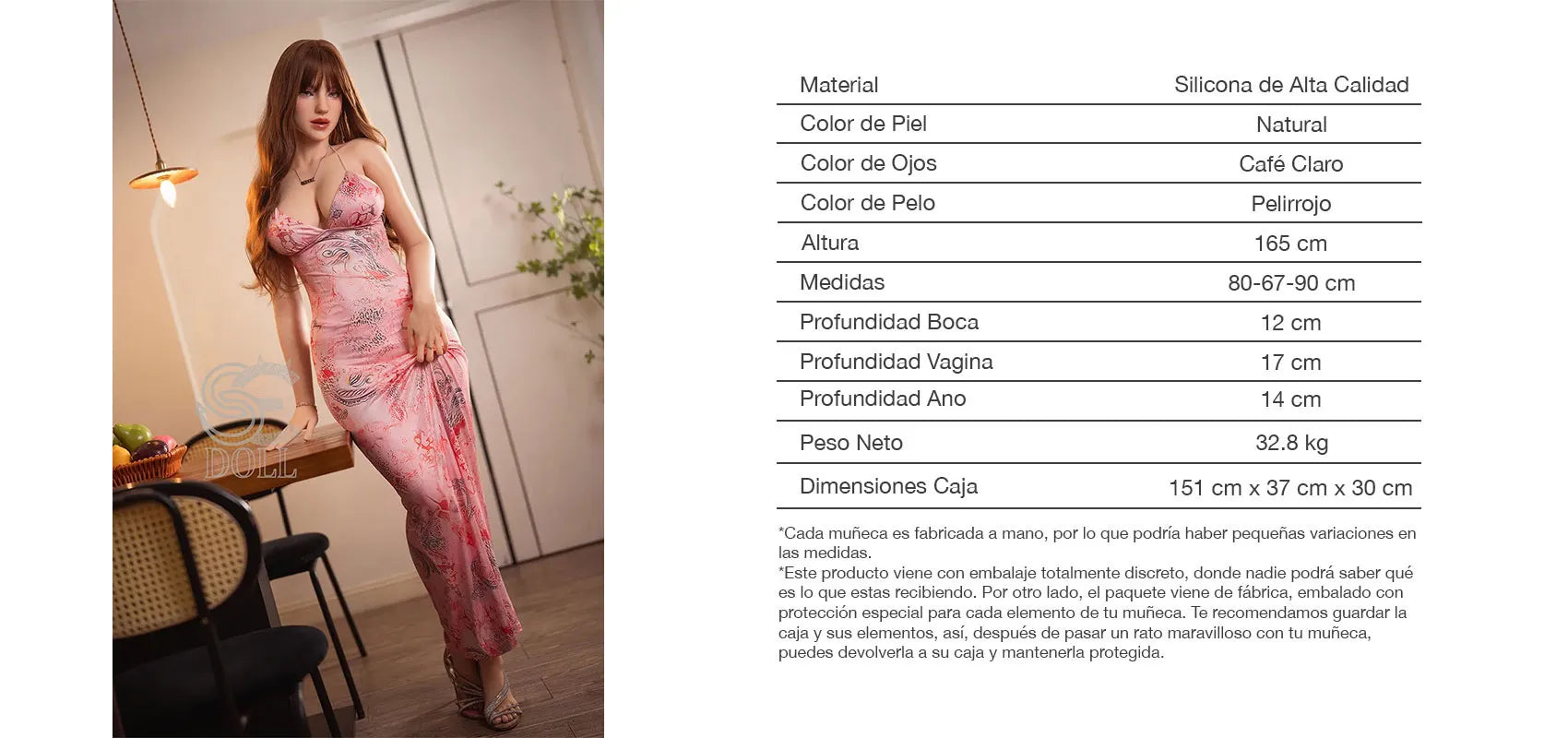 La caja vendrá sin ningún tipo de etiqueta o dibujo que haga referencia a una muñeca sexual, por lo que nadie más que tu sabrá lo que esta dentro. Las personas que vean tu caja pensaran que es un mueble, una lampara, o cualquier otro producto.