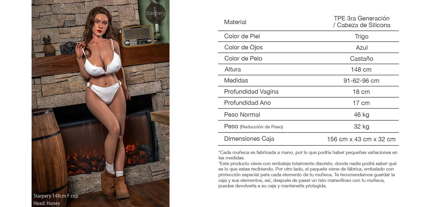 ¡Conoce a Honey! Una muñeca sexual realista pequeña pero muy bien equipada. Déjate seducir por su voluptuoso cuerpo y atrévete a explorar las posiciones más apasionadas con ella. Honey está completamente diseñada para complacerte y cumplir tus fantasías más ardientes.