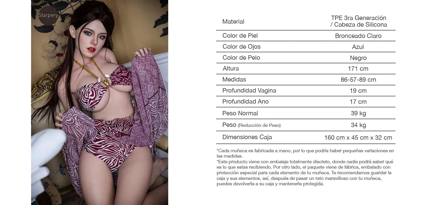 Starpery destaca por su dedicación a la calidad, fabricando una muñeca sexual, combinando su experiencia en muñecas híbridas y full silicona para lograr un resultado realista. El nivel de detalle y la confección artesanal las hacen altamente realistas. Gracias a su tecnología de aligeramiento, estas muñecas son más fáciles de usar y mantener.