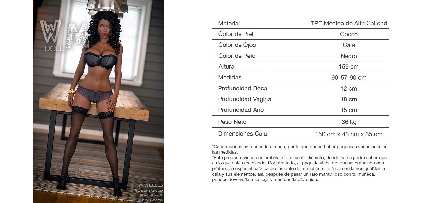 Reconocida por su calidad, WM Dolls produce muñecas para sexo a partir de TPE ecológico, reconocido por su alta calidad, su suavidad extrema y su durabilidad superior. Cada detalle ha sido diseñado para maximizar el realismo, desde la textura hasta el peso y la flexibilidad. Esta muñeca sexual realista presenta una alternativa de alto nivel para quienes desean una experiencia íntima sin comprometer el realismo.