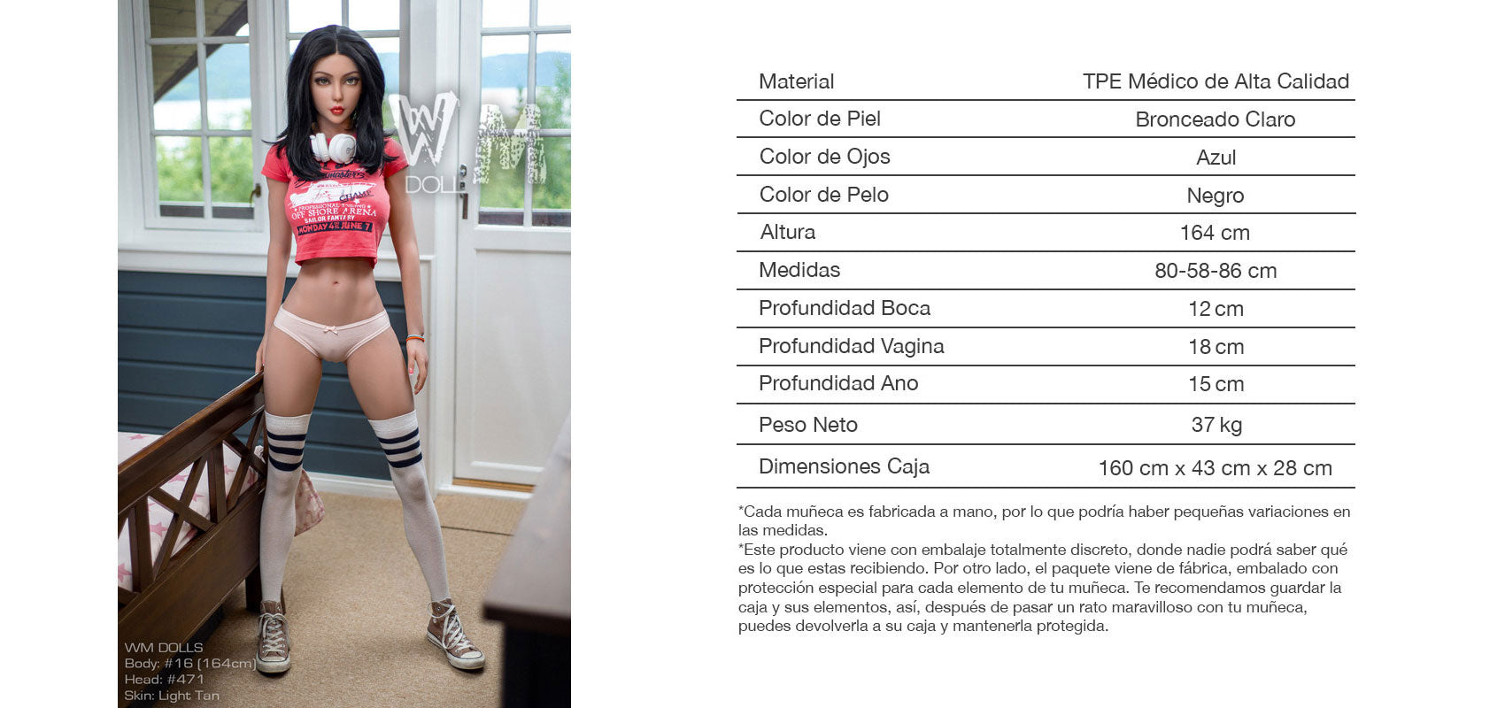 WM Dolls se ha consolidado como una marca líder en el desarrollo de productos realistas, ofreciendo muñecas sexuales utilizando TPE de alta gama, un material suave, elástico e hipoalergénico, ideal para el contacto con la piel. Este material no solo proporciona una experiencia de uso más realista, sino que también extiende la vida útil del producto. Estas sex dolls son una excelente opción para quienes valoran la calidad y la fidelidad al cuerpo humano.